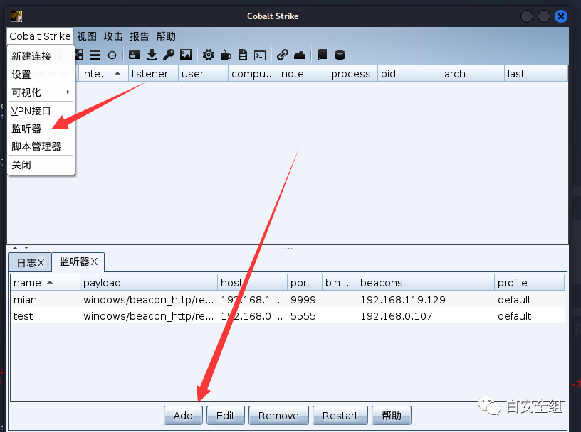 点击连接就好,成功启动后我们需要先生成一个监听器,这样我们才有一个能监听的端口。