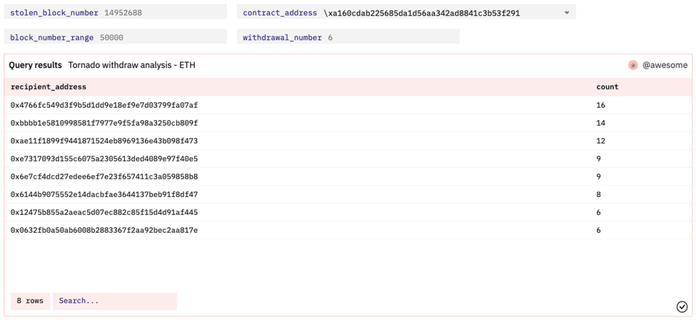 通过这个 Tornado.Cash 资金转出的分析方法,我们已成功分析出 Ronin Network 等多个安全事件从 Tornado.Cash 转出后的资金详情。