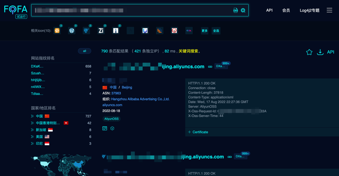 使用 FOFA 查了一下,大概有 790 个阿里云OSS存在相关风险