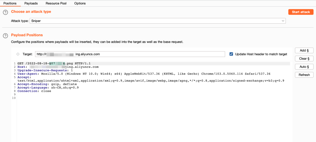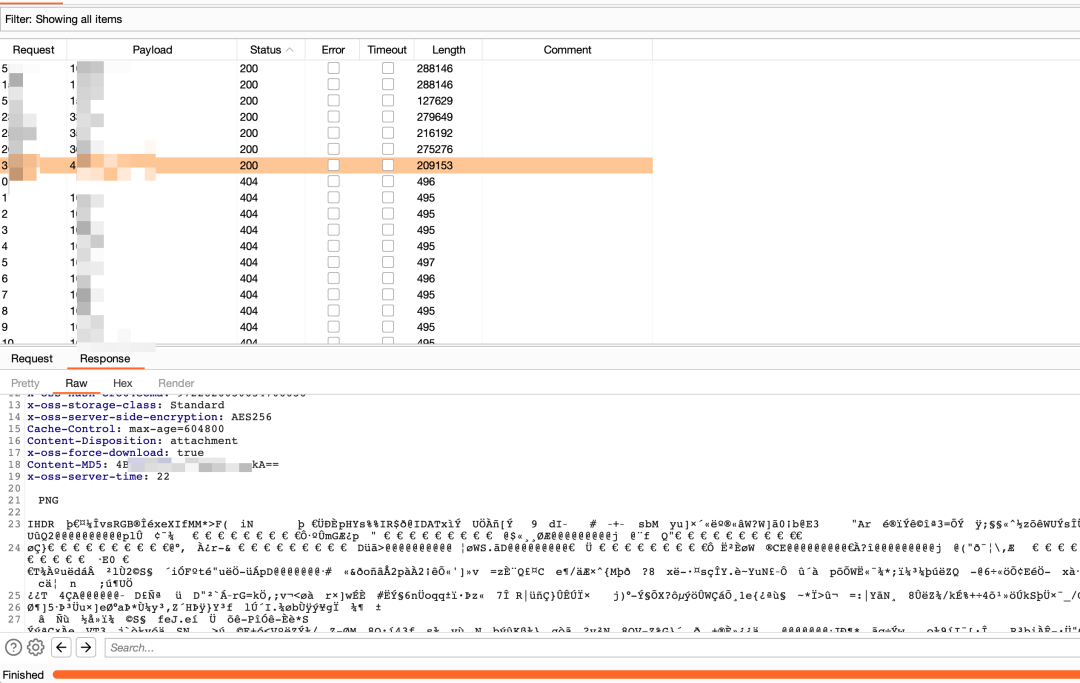 这里小范围模拟暴力破解,共发包9000个,在这期间阿里云应该是有一些拦截,短时间卡住2~3次,每次15~30秒,但是并没有封禁IP,最终发现7张图片