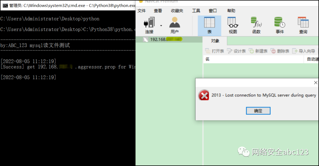 为了模拟红队人员连接mysql的行为,使用navicat远程连接一下这个蜜罐的ip地址。(再次强调一下,无需知道mysql的用户名密码即可,输入一个错误的用户名密码,mysql蜜罐同样可以读取本地文件)