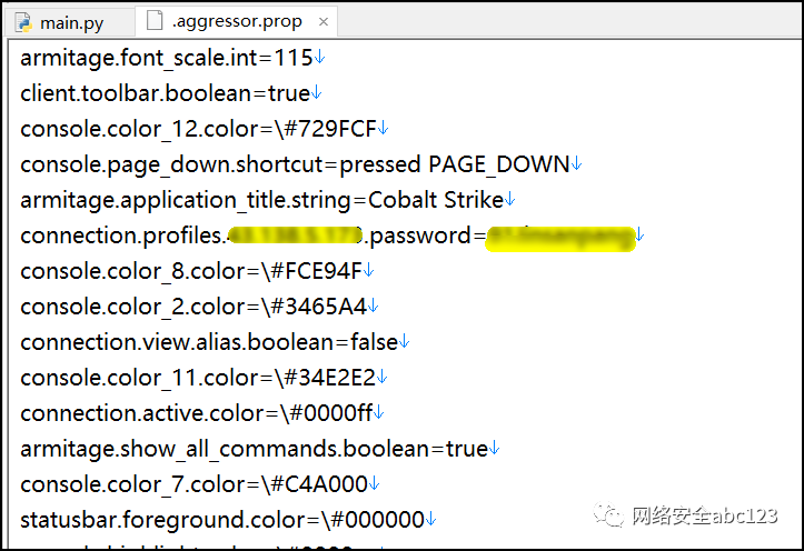 每次打开cs都会显示出曾经登录后的ip地址、端口、用户名、密码等信息,这些信息都是存储在本地.aggressor.prop文件中的,大致内容如下图所示: