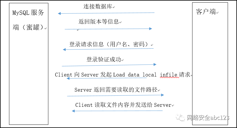 关于Mysql蜜罐的具体技术细节,网上文章介绍的太多了,大家可以自己从网上搜索文章,我写一个简介吧:mysql中有一个load data local infile函数能够读取本地文件到mysql数据库中。当攻击者用爆破mysql密码的扫描器扫描到我们的mysql并连接上的时候(注,这里我纠正一下,只要连接一下蜜罐mysql,就可以被蜜罐读取到本地配置文件,不需要提供正确的用户名密码),客户端(攻击者)会自动发起一个查询,我们(服务端)会给与一个回应,我们在回应的数据包中加入load data local infile读取攻击者的本地文件到我们数据库中,达到反制的目的。(以下图片来源于网络搜索)