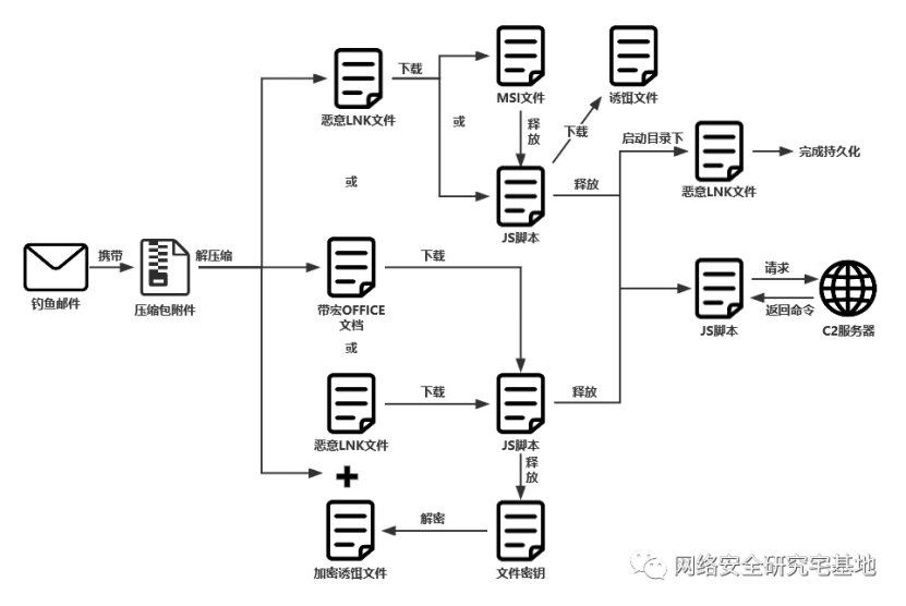近日,安恒信息的猎鹰实验室捕获到Lazarus组织的攻击样本,初始接入使用钓鱼邮件附件和链接的方式传播,诱导用户下载恶意压缩包,并执行压缩包中的恶意文件。下图是攻击流程图。但此次攻击有所变化的是,采用了MSI文件执行嵌入脚本的方式来执行其恶意载荷,并使用三种方法来逃避检测:(1)expand.exe是系统用于解压压缩包的程序,但可以被用来进行文件复制,代替敏感的copy命令;(2)复制并重命名msiexec.exe,以逃避对msiexec.exe的执行检测;(3)pcalua.exe是windows程序兼容性助手,是系统的白名单程序,攻击者使用该程序调用重命名为pat.exe的msiexec.exe,访问远程服务器上的恶意msi文件,从而逃避检测。
