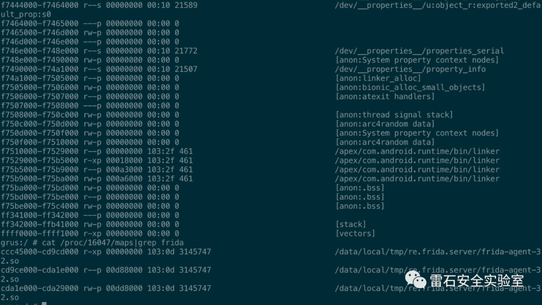 这里当挂上frida后对应的maps文件中会出现re.frida.server之类的特征,这是在使用frida server的时候自动创建的,其中存放着frida的功能模块,可以在载入so的hook脚本输出中能看到最后也是断在frida-agent.so。