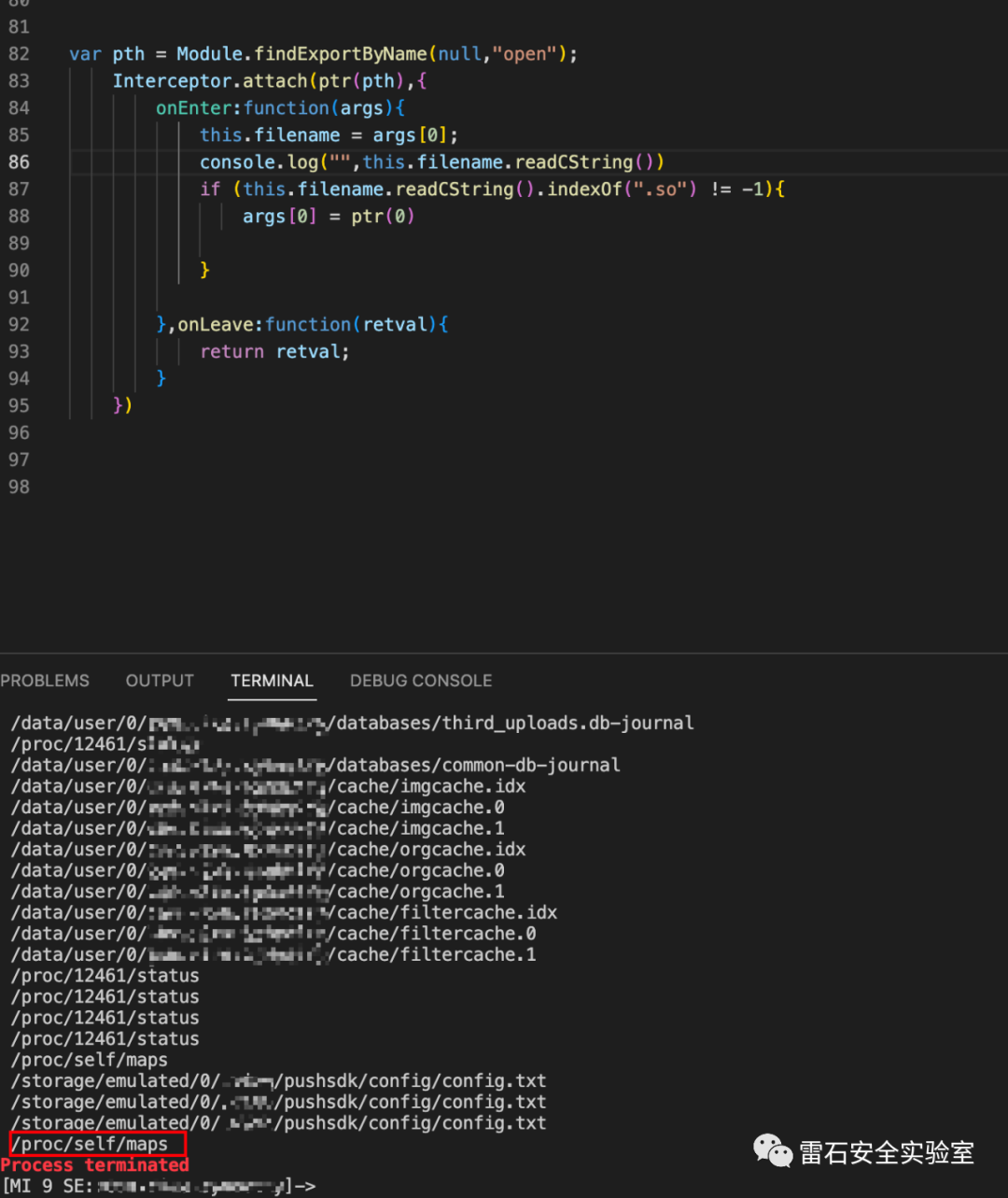 function main() {const openPtr = Module.getExportByName('libc.so', 'open');const open = new NativeFunction(openPtr, 'int', ['pointer', 'int']);var readPtr = Module.findExportByName("libc.so", "read");var read = new NativeFunction(readPtr, 'int', ['int', 'pointer', "int"]);var fakePath = "/data/data/com.app/maps";var file = new File(fakePath, "w");var buffer = Memory.alloc(512);Interceptor.replace(openPtr, new NativeCallback(function (pathnameptr, flag) {var pathname = Memory.readUtf8String(pathnameptr);var realFd = open(pathnameptr, flag);if (pathname.indexOf("maps") >= 0) {while (parseInt(read(realFd, buffer, 512)) !== 0) {var oneLine = Memory.readCString(buffer);if (oneLine.indexOf("tmp") === -1) {file.write(oneLine);}}var filename = Memory.allocUtf8String(fakePath);return open(filename, flag);}var fd = open(pathnameptr, flag);return fd;}, 'int', ['pointer', 'int']));}setImmediate(main)