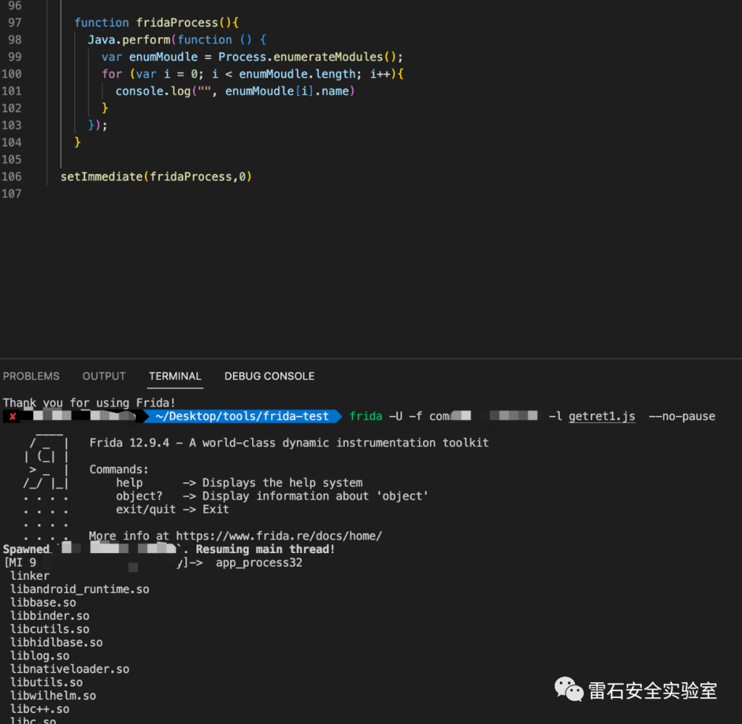 function fridaProcess(){Java.perform(function () {var enumMoudle = Process.enumerateModules();for (var i = 0; i < enumMoudle.length; i++){console.log("", enumMoudle[i].name)}});}setImmediate(fridaProcess,0)