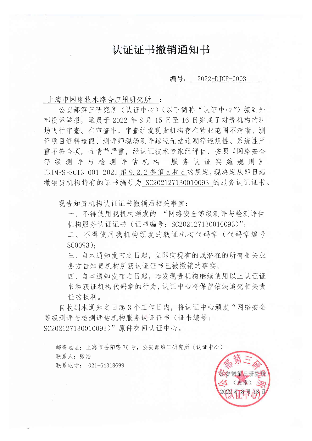 近日,接有关单位举报,中关村信息安全测评联盟(以下简称“联盟”)派出专家组对上海市网络技术综合应用研究所进行了现场检查,发现该机构归档项目与上报项目差异巨大、大量等级测评项目没有项目实施记录。经进一步核实确认,该机构存在多个项目现场测评活动弄虚作假等情况,性质恶劣,情形严重,严重违反《网络安全等级测评与检测评估机构自律规范》有关规定,严重扰乱等级测评市场秩序,无法保证相关网络运营者信息系统等级测评结论客观公正。依据《网络安全等级测评与检测评估机构自律规范》第三十条规定,经联盟理事会研究决定:取消上海市网络技术综合应用研究所联盟会员资格。中关村信息安全测评联盟