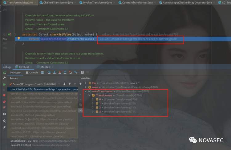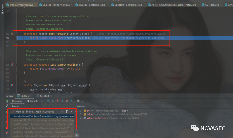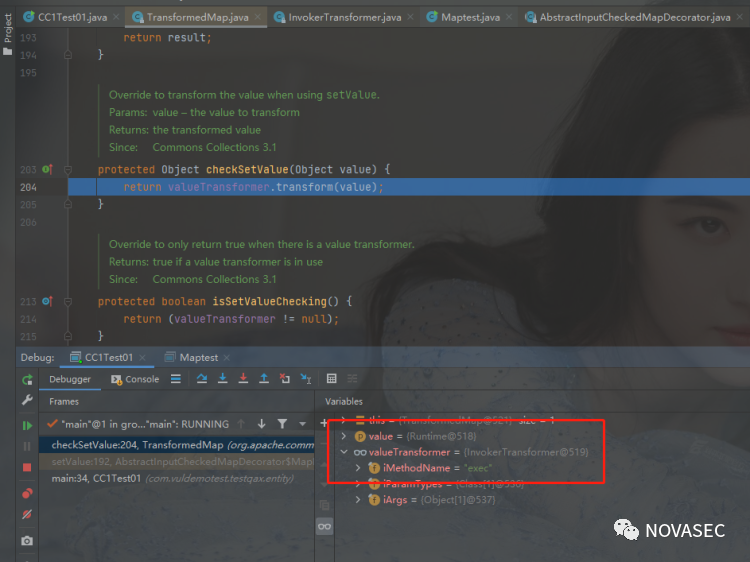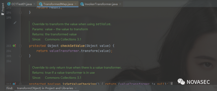 跟进查看TransformedMap的checkSetValue方法,该方法会执行transform方法,但是需要查看valueTransformer是否可控