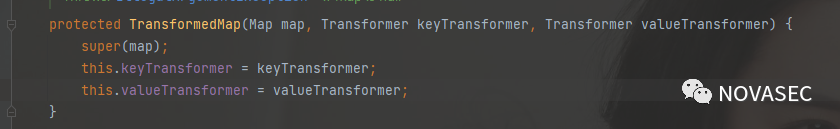如何给valueTransformer传入InvokerTransformer对象,这里可以看到返回一个TransformedMap对象,而TransformedMap构造方法需要传入Transformer valueTransformer,那么只要传入一个Transformer子类InvokerTransformer的valueTransformer即可