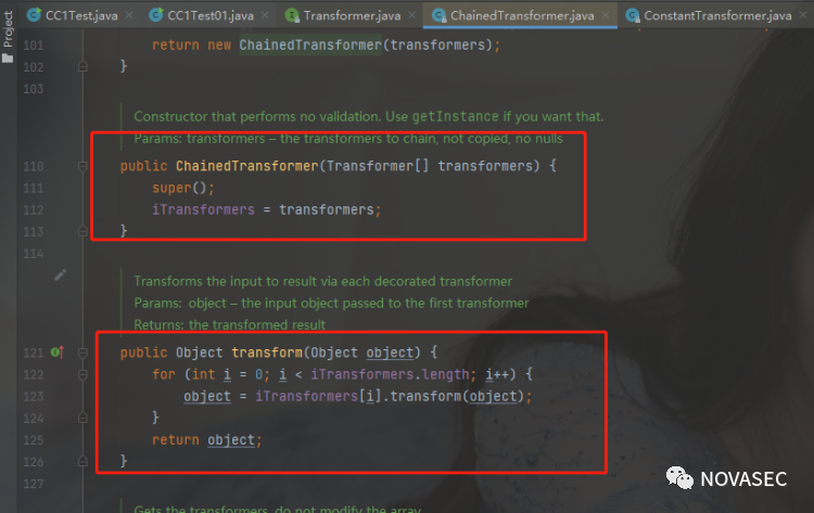 ChainedTransformer方法接收Transformer对象,保存为Transformer数组,transform方法接收Transformer数组,也就是ChainedTransformer方法中的iTransformers,进行循环调用,前一个的输出作为后一个的输入