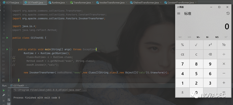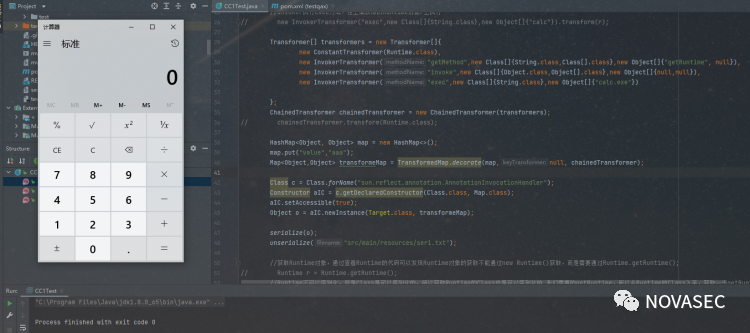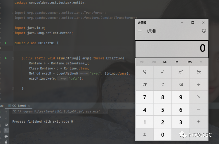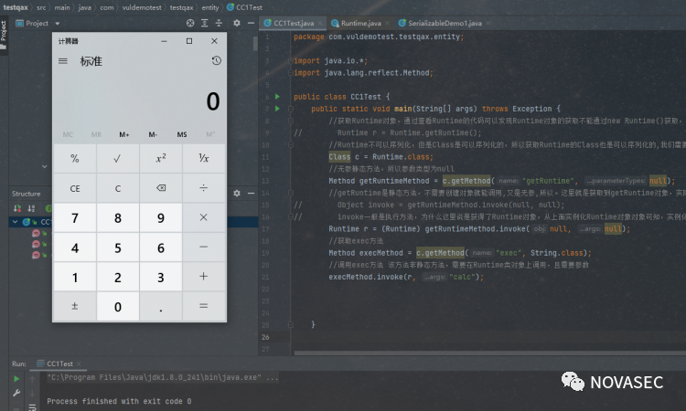 public static void main(String[] args) throws Exception {//获取Runtime对象,通过查看Runtime的代码可以发现Runtime对象的获取不能通过new Runtime()获取,而是需要通过Runtime.getRuntime();// Runtime r = Runtime.getRuntime();//Runtime不可以序列化,但是Class是可以序列化的,所以获取Runtime的Class也是可以序列化的,我们需要的getRuntime,所以从Runtime的Class入手,获取一个getRuntimeClass c = Runtime.class;//无参静态方法,所以参数类型为nullMethod getRuntimeMethod = c.getMethod("getRuntime", null);//getRuntime是静态方法,不需要创建对象就能调用,又是无参,所以。这里就是获取到getRuntime对象,实际上就是Runtime对象,强转一下// Object invoke = getRuntimeMethod.invoke(null, null);// invoke一般是执行方法,为什么这里说是获得了Runtime对象,从上面实例化Runtime对象对象可知,实例化Runtime对象就是需要通过getRuntime()方法,所以这里是执行getRuntime()方法,那么获得的就是Runtime对象Runtime r = (Runtime) getRuntimeMethod.invoke(null, null);//获取exec方法Method execMethod = c.getMethod("exec", String.class);//调用exec方法 该方法非静态方法,需要在Runtime类对象上调用,且需要参数execMethod.invoke(r, "calc");}