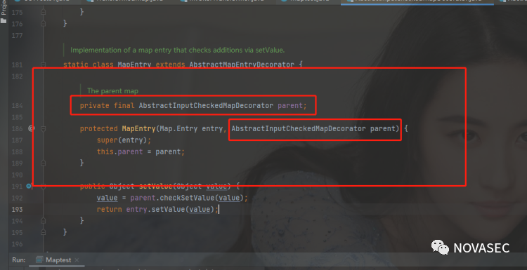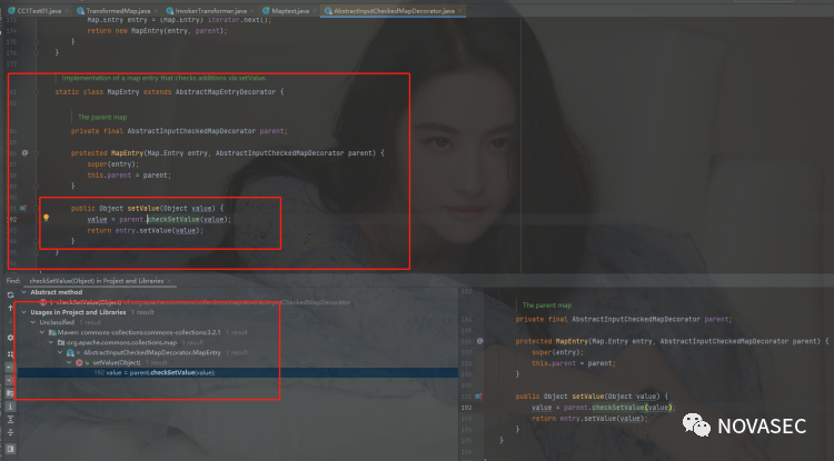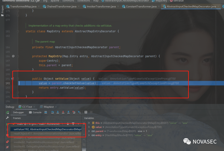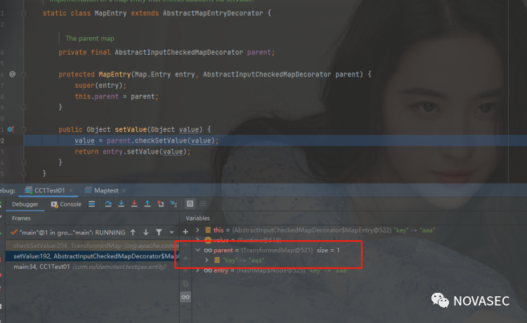 那么在使用MapEntry的时候,不对Map数组进行遍历,而是对TransformedMap数组进行遍历,然后在遍历过程中执行setValue方法,这个时候的parent是TransformedMap,进而会进入TransformedMap调用checkSetValue方法。