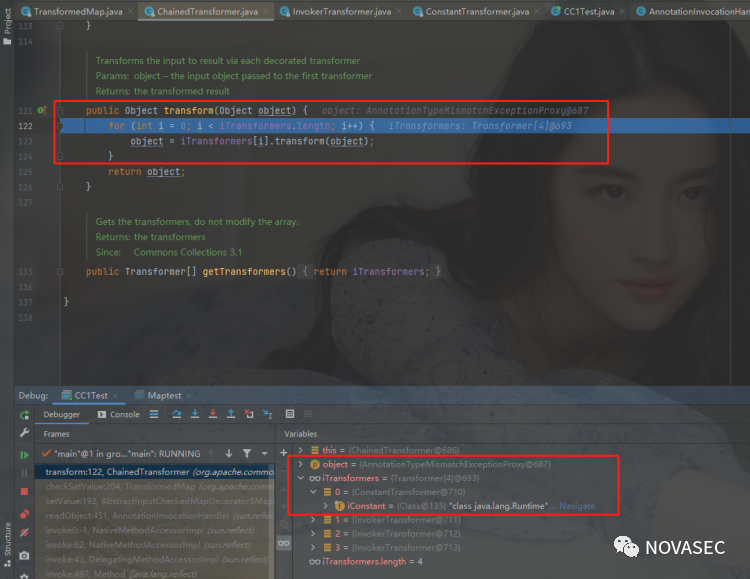 new InvokerTransformer("getMethod",new Class[]{String.class,Class[].class},new Object[]{"getRuntime", null}).transform(Runtime.class)上面返回的参数又被传入下一个参数,最后成功执行了exec方法