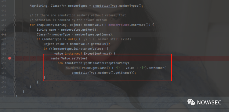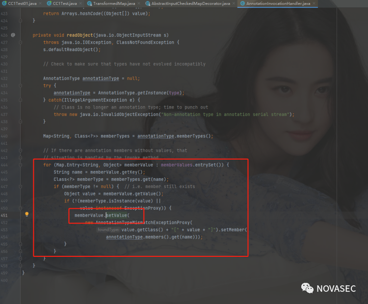 AnnotationInvocationHandler类中的readObject方法中存在setValue方法,该内容也完全符合前面的模式