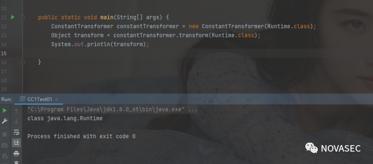 因为Transformer数组的第一个参数new ConstantTransformer(Runtime.class),在ChainedTransformer的transform方法中,就是ConstantTransformer(Runtime.class).transform(AnnotationTypeMismatchExceptionProxy对象),所以最后返回了的就是Runtime.class。