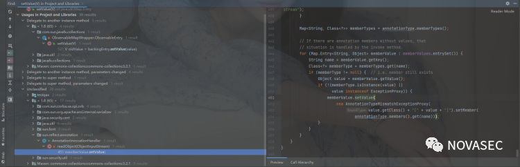因此需要寻找setValue方法的调用,而且尽量是找readObject方法直接调用的