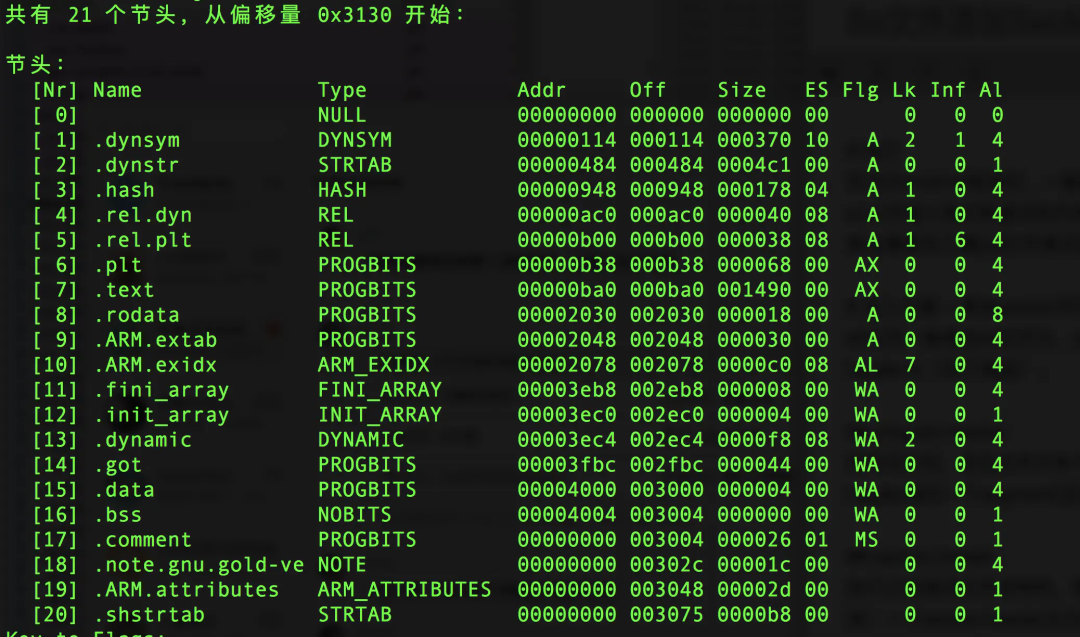 section段是elf文件的主题,很多内容都保存在里面,包括我们熟悉的.text、.rodata、.data等等,还有我们不熟悉的.got(全局偏移表)、.plt(过程链接表)等等,这两个表主要用于函数和全局变量的调用,可参考这个链接理解这两个表,下面是展示部分的section header头: