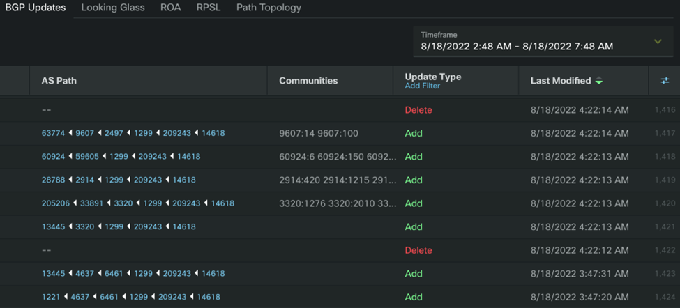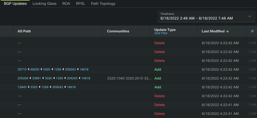 我们可以看到在 2022-08-17 19:19:23 +UTC -- 2022-08-17 23:19:23 +UTC 时间段内,BGP 路由路径的信息出现较大的波动性变化。