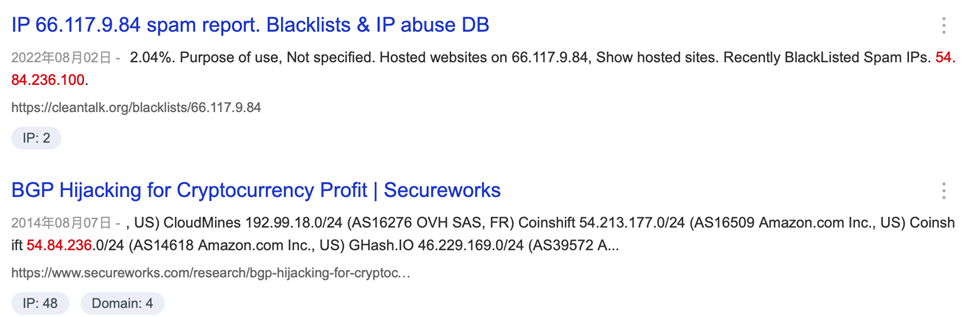 并且我们通过情报社区获得 54.84.236.100 相关情报,其中有一则情报提到 54.84.236.100 与 2014 年的一起 BGP Hijacking 事件有关,但是由于这起事件的时间太久了,可能暂时不具备时效性。