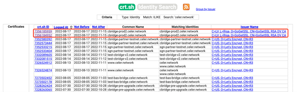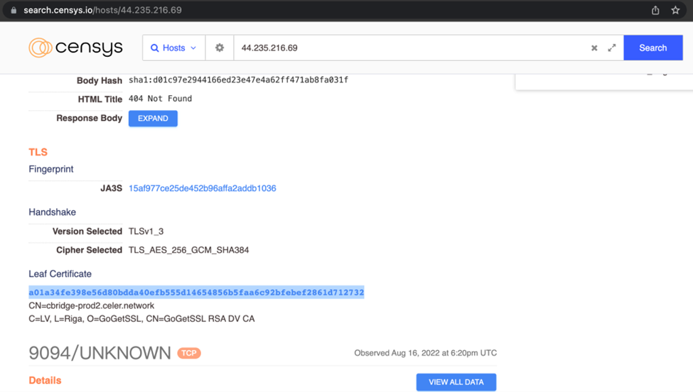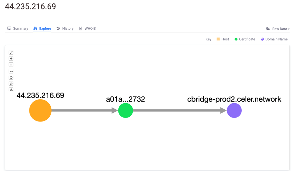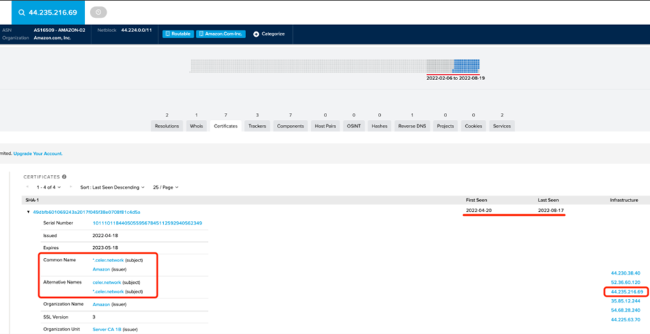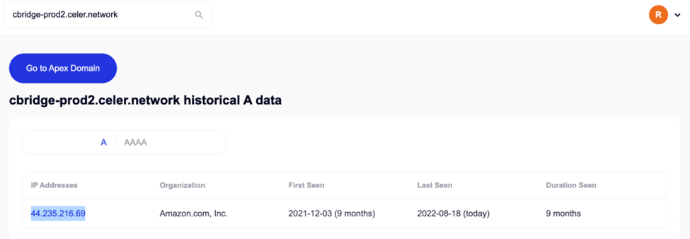 cbridge-prod2.celer.network 长时间解析到 44.235.216.69,证明这个 IP 应该是属于 Celer Network 官方服务器的 IP 地址,经过与 Celer Network 团队进行确认 44.235.216.69 是属于他们的 IP,但是为什么会有假证书绑定在这个 44.235.216.69 IP 上呢?
