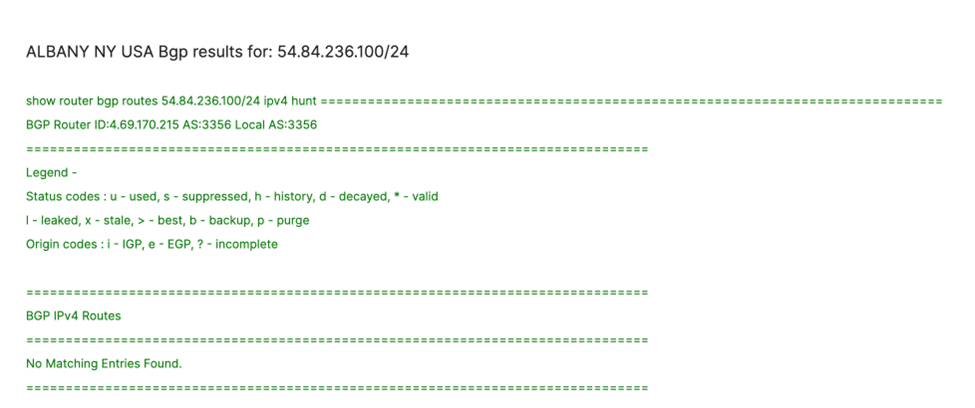 追踪攻击 IP: 54.84.236.100 的 BGP Trace 记录,发现目前已经无法找到这条路由。