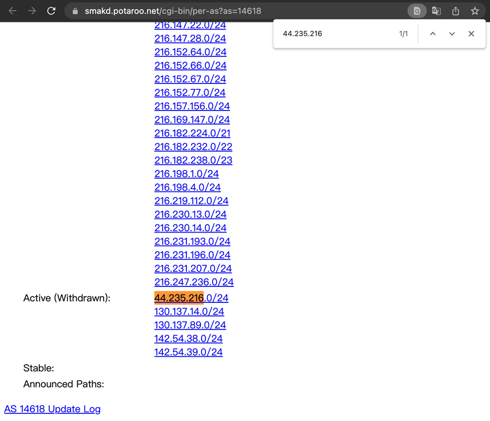 我们继续追踪 AS 变动记录,发现 AS14618 历史上包含了 44.235.216.0/24 这条路由信息,但是后面将这条路径发生了 Withdrawn,这证明: