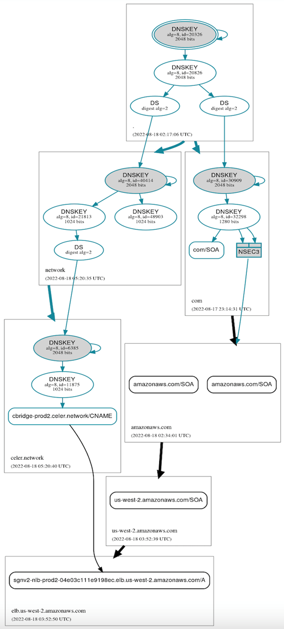 开始的时候 Celer Network 团队初步怀疑是 DNS Hijacking,在与 Celer Network 团队进行沟通讨论后得到出问题的域名信息:cbridge-prod2.celer.network,并且根据用户的反馈,在攻击期间浏览器并没有提示证书错误,因此先排查下 DNS Hijacking 的可能性。(这里特别感谢 Twitter 用户 @greysign1 的帮助,协助我们快速排查 DNS Hijacking 的可能性)