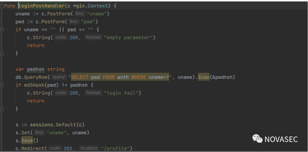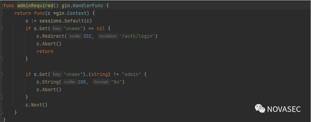 从上面代码可以看到,生成cookie的值是通过go的math/rand这个库来生成16位的伪随机数,然而并没有指定种子,没有调用seed函数的时候,默认随机数种子为1,同时判断是否为管理员的方法是从session中取出uname键是否等于"admin"。