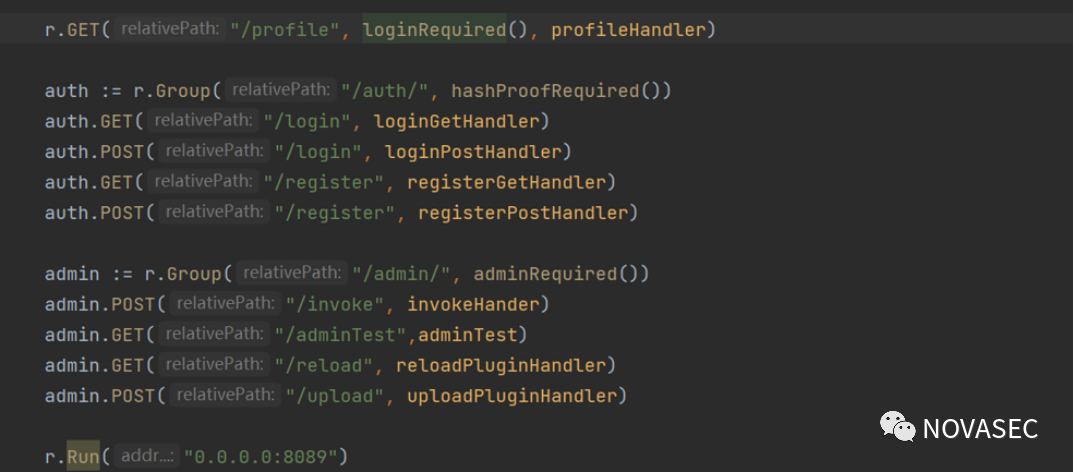 1、main.go里初始化了一些数据库操作,还利用loadPulgin来载入plugin面就是一些路由的定义。2、handler.go中定义了一些路由请求处理。3、utiil.go顾名思义就是工具类。4、admin_handler.go 就是加载.so还有一些后台的路由。
