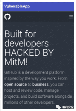 在下面的示例中,实现了一个 WebView 来加载网页https://github.com。执行了中间人攻击,受害设备中的结果是一个空白屏幕,因为 WebView 检测到无效证书并且没有建立与 GitHub 服务器的连接。