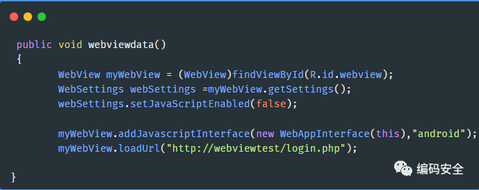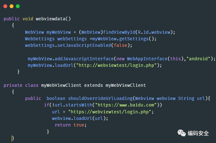 上面显示的代码将这个应用程序的 WebView 限制为仅从 baidu域加载网页。请注意,原始 URL“ http://webviewtest/login.php”将被正确加载。这是保护 WebView 的一种非常有效的方法。可以添加其它检测功能,并在检测到攻击时发出警报。
