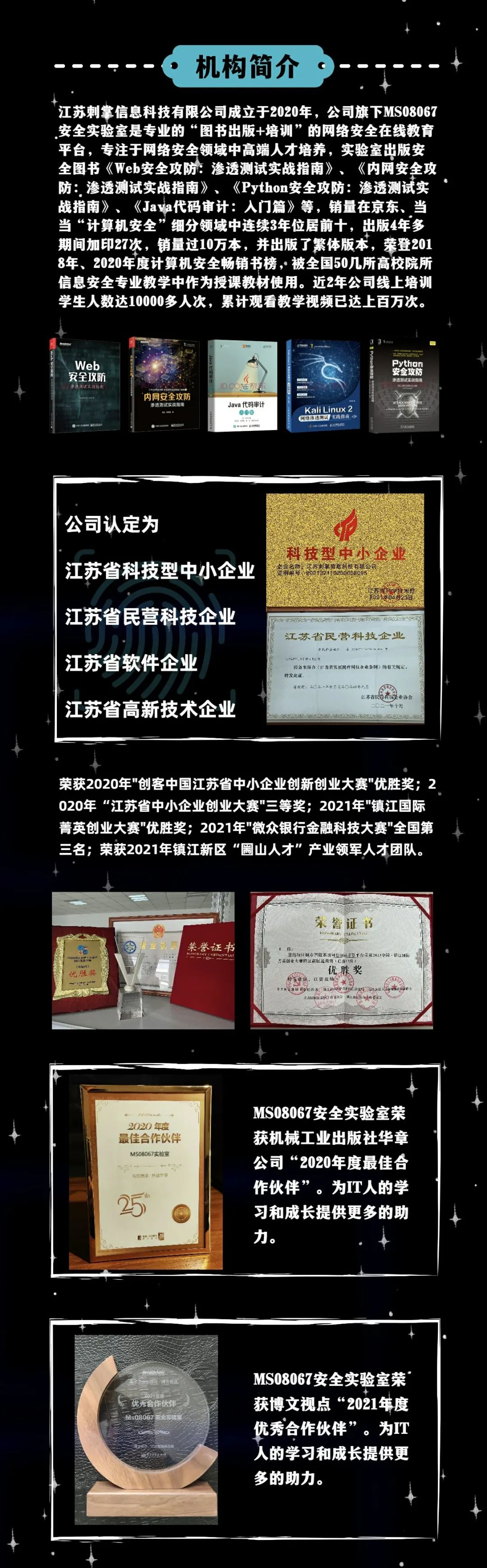 MS08067近年来在安全界的口碑还是有目共睹的,特别是对信安感兴趣的学生、爱好者做了些有意义的事情,是真心实意的为读者,绝无半点虚假,做星球的初衷也是为了满足读者对于图书配套视频的需求,不像一些培训把心思花在宣传、花在“卖教程”上,实验室4年出版了5本原创图书就可以看出我们的初心和技术能力。