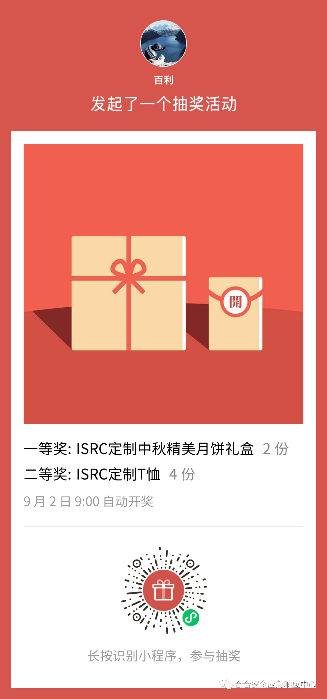 即日起至2022年8月28日12:30前(为期一周的时间),分享本篇活动文章至微信朋友圈后通过下面的抽奖小程序进行抽奖,即有机会获得如下礼品(领奖时需凭朋友圈截图发送至合合安全响应中心后台领取哦):