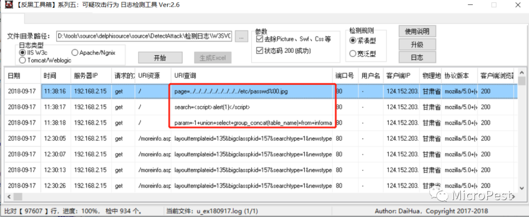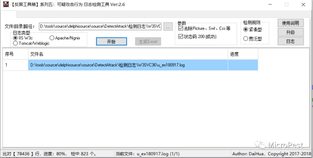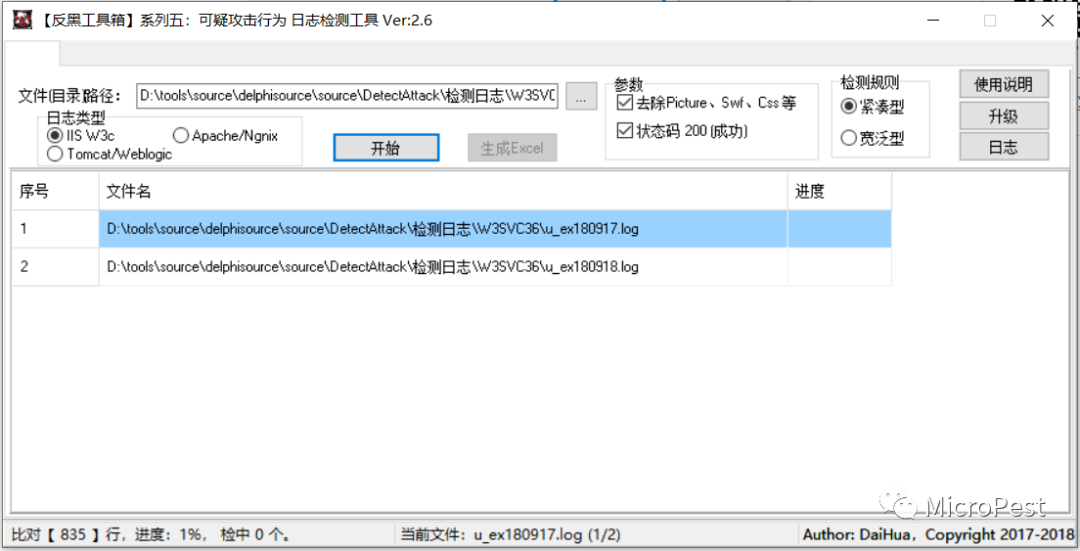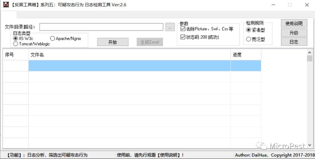 这也是我系列反黑工具箱中的一款工具:可疑攻击行为日志检测工具,主要是从海量日志中利用Waf规则检测出可疑攻击行为,从而缩短排查时间、缩小排查范围,成为我们的有力武器。目前,工具支持的日志主要有:“IIS、Apache/Nginx、Tomcat/Weblogic”等几种主流日志。