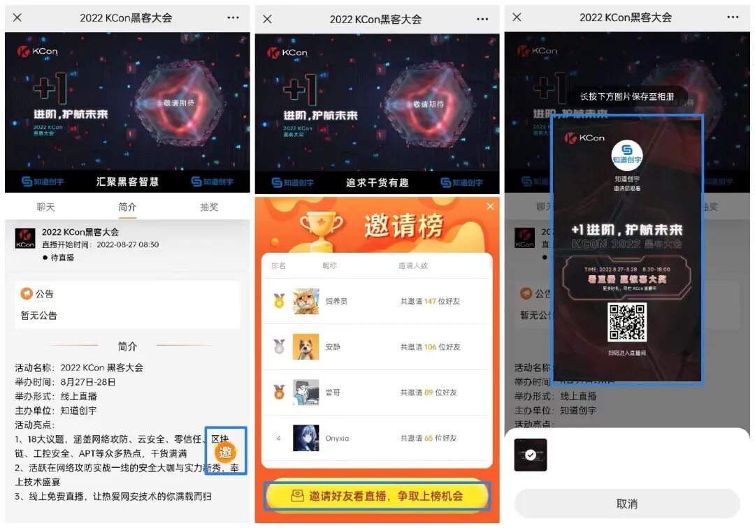 2022年8月29日上午11时前,进入 KCon 2022 直播间的朋友可参与“邀好友 看直播 赢福利”活动,在直播间领取专属邀请卡,邀请好友进入直播间观看。