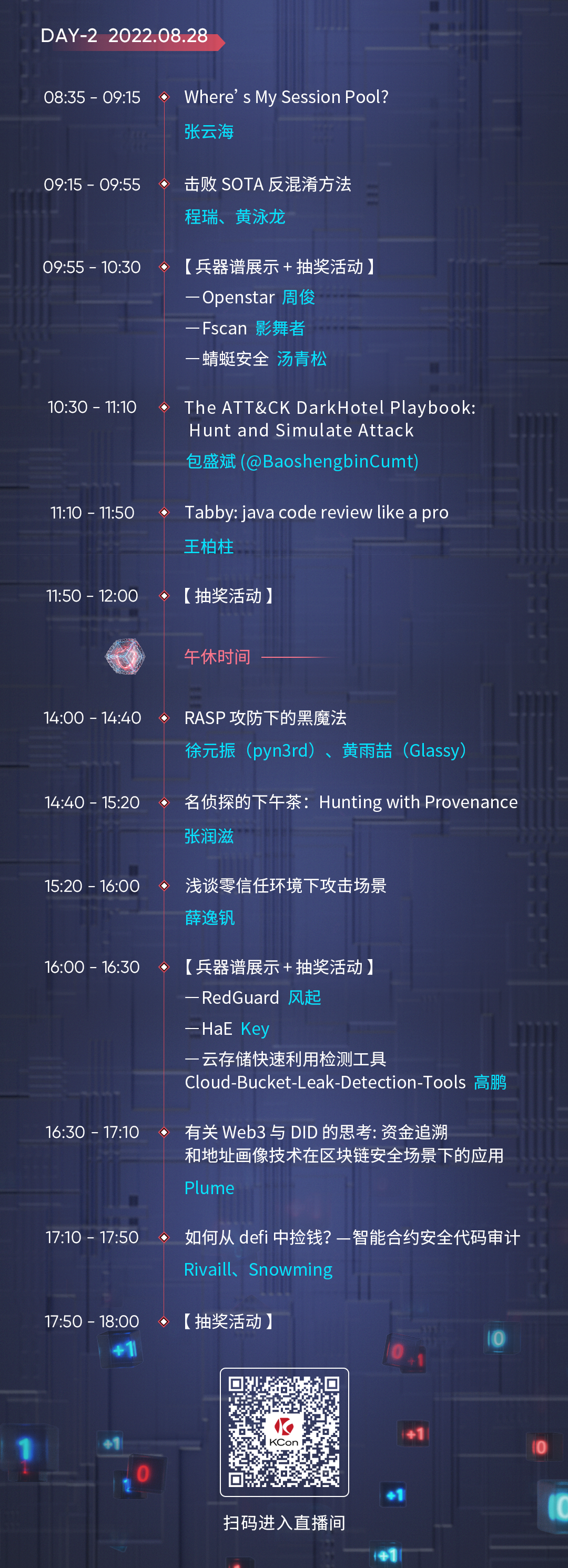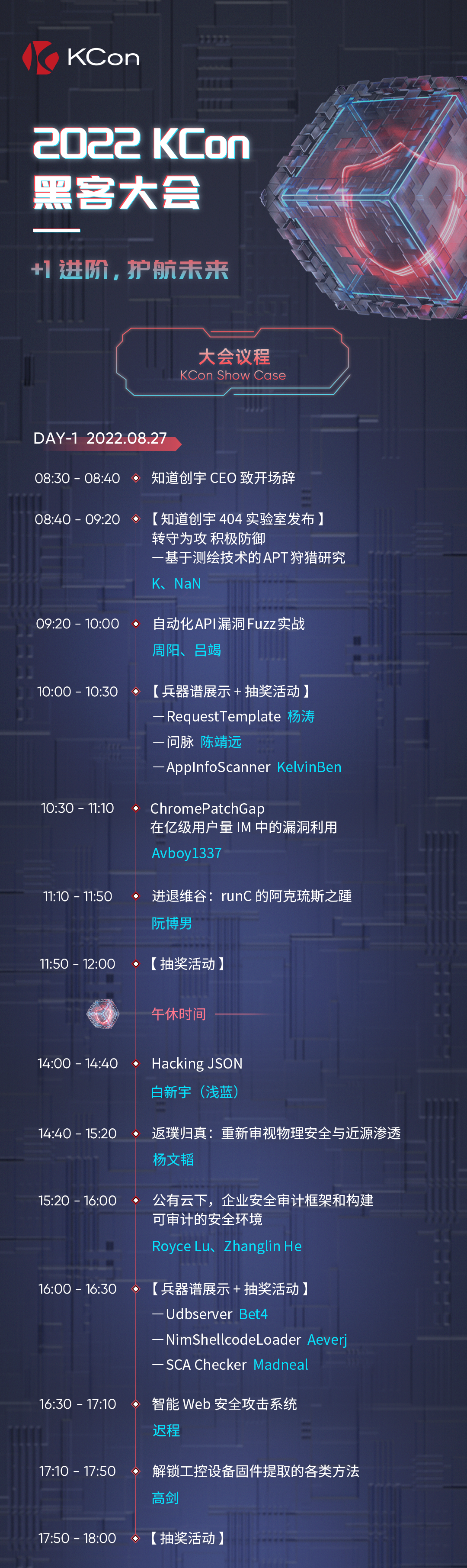 KCon 2022 议程已出炉,两天的 KCon Show Case 汇聚了18大干货议题分享,涵盖网络攻防、云安全、零信任、区块链、工控安全、APT等众多热点话题。