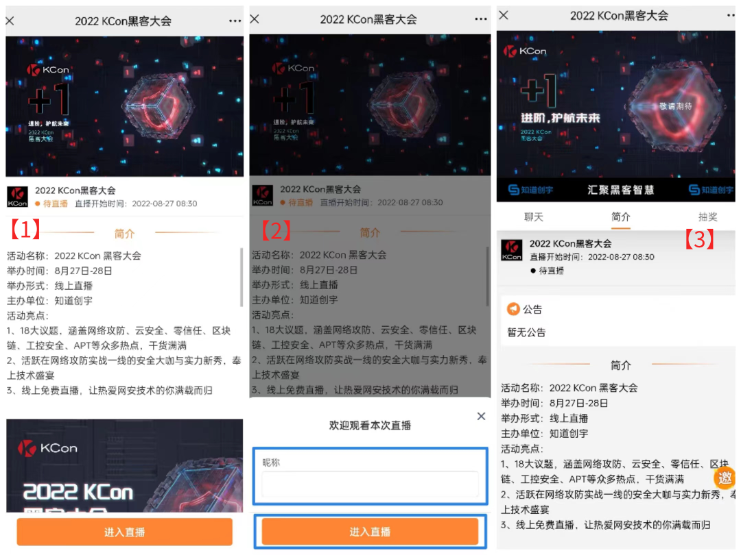 移动端:扫描上方二维码进入下图【1】界面,点击“进入直播”后出现【2】界面,填写您的昵称如“知道创宇”,再次点击“进入直播”后出现【3】界面,等待直播开始即可~