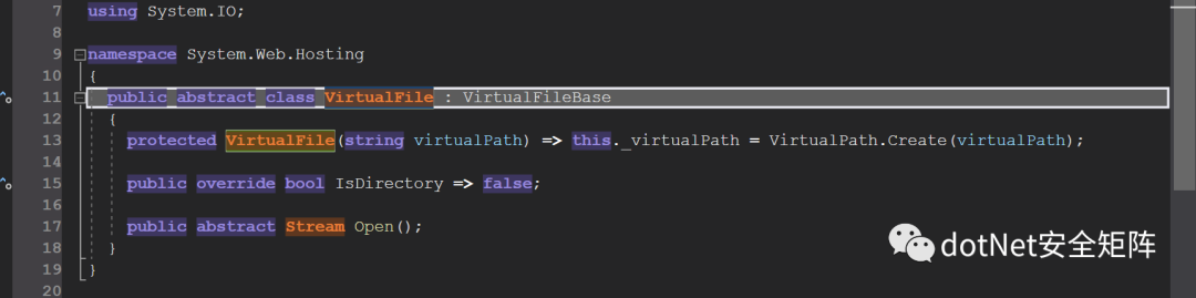 首先来看VirtualPathProvider类,此类中定义了的FileExists、GetFile等方法非常有用,笔者也是重写这两个方法达成虚拟WebShell,先不谈继续往下看此类被定义在 System.Web.Hosting 命名空间里使 Web 应用程序可以从虚拟文件系统中检索注册的资源,该类位于System.Web.dll文件,自身是一个抽象类继承于父类MarshalByRefObject,因为是抽象类不能直接被实例化所以笔者需要自定义一个类去实现它。VirtualPathProvider.FileExists()表示文件是否存在于虚拟文件系统中告诉系统是否存在请求路径,如果存在则事件通知继续调用 GetFile 方法,VirtualPathProvider.GetFile() 表示从虚拟文件系统中获取一个虚拟文件,代码如下