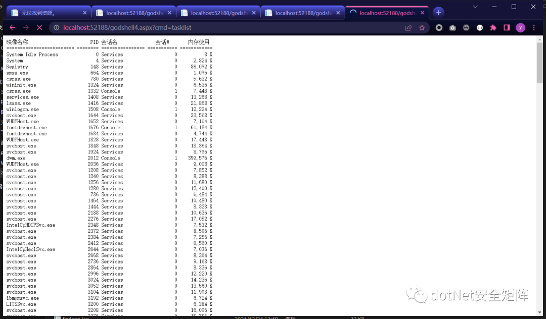 运行第1步访问 /dotNetofVirtuaFile.aspx 将虚拟Webshell注入到内存,并删除此文件;第2步访问 /godshell.aspx?cmd=ipconfig 得到预期的结果信息,还可以扩展多个文件如 /godshell4.aspx?cmd=tasklist