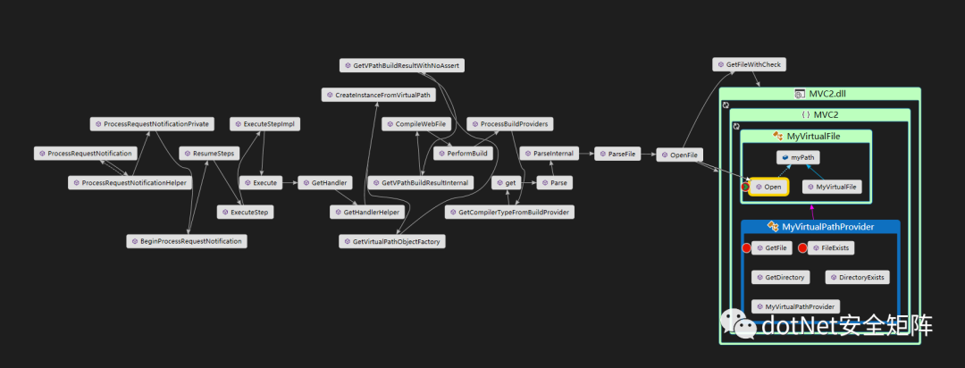BuildProvider类的GetCompilerTypeFromBuildProvider方法实现将文件内容转换成相应的源代码,紧接着System.Web.UI.TemplateParser类的ParseFile方法传递虚拟地址,到这里开始进入VirtualPathProvider类的OpenFile方法调用Open方法读取虚拟文件内容返回流数据,整个调用栈的过程如下图所示