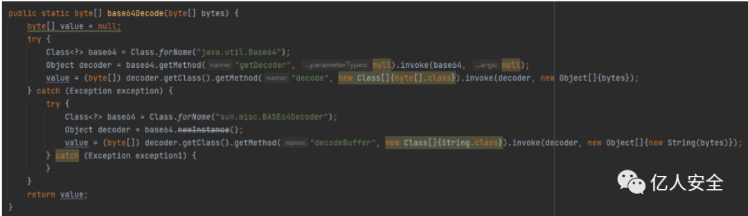} catch (Exception exception) { try { Class<?> base64 = Class.forName("sun.misc.BASE64Decoder"); Object decoder = base64.newInstance(); value = (byte[]) decoder.getClass().getMethod("decodeBuffer", new Class[]{String.class}).invoke(decoder, new Object[]{new String(bytes)});