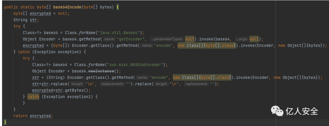 } catch (Exception exception) { try { Class<?> base64 = Class.forName("sun.misc.BASE64Encoder"); Object Encoder = base64.newInstance(); value = ((String) Encoder.getClass().getMethod("encode", new Class[]{byte[].class}).invoke(Encoder, new Object[]{bytes})).getBytes();