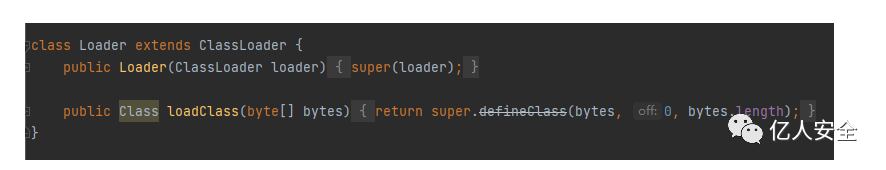 } public Class loadClass(byte[] bytes) { return super.defineClass(bytes, 0, bytes.length);