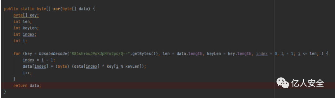 byte[] key; int len; int keyLen; int index; int i; for (key = base64Decode("R84sh+6uJ9oXJpMfw2pc/Q==".getBytes()), len = data.length, keyLen = key.length, index = 0, i = 1; i <= len; ) {