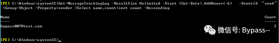Get-MessageTrackingLog -ResultSize Unlimited -Start (Get-Date).AddHours(-6) -EventId “send” |Group-Object -Property:sender |Select name,count|sort count -DescendingPowershell+定时任务,可实现定时推送Exchange邮件发送统计报告,发现异常的用户邮箱。